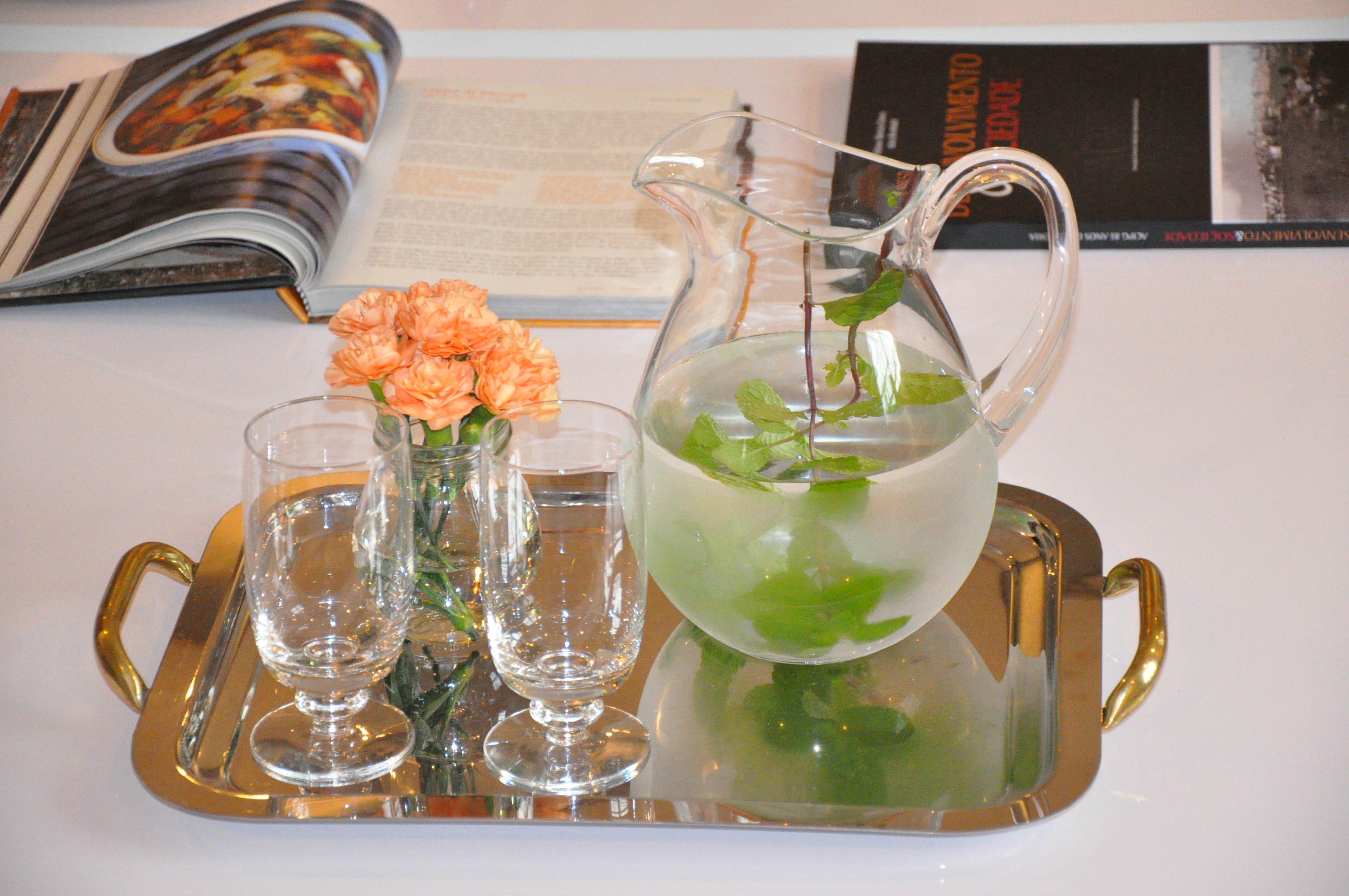 Uma dica legal para quem quer dar um toque diferente em algo tão simples como a água é fazê-la aromatizada. A foto que vocês estão vendo mostra uma água aromatizada com hortelã, a minha preferida. Mas você pode misturar vários aromas como por exemplo misturar rodelas de limão siciliano junto com a hortelã, fatias de maçã misturadas com canela em pau ou cravos da índia, frutas, etc. Tome o cuidado para que as frutas não estejam muito maduras e fiquem despedaçadas demais, o gosto é ótimo, mas o visual também é importante.