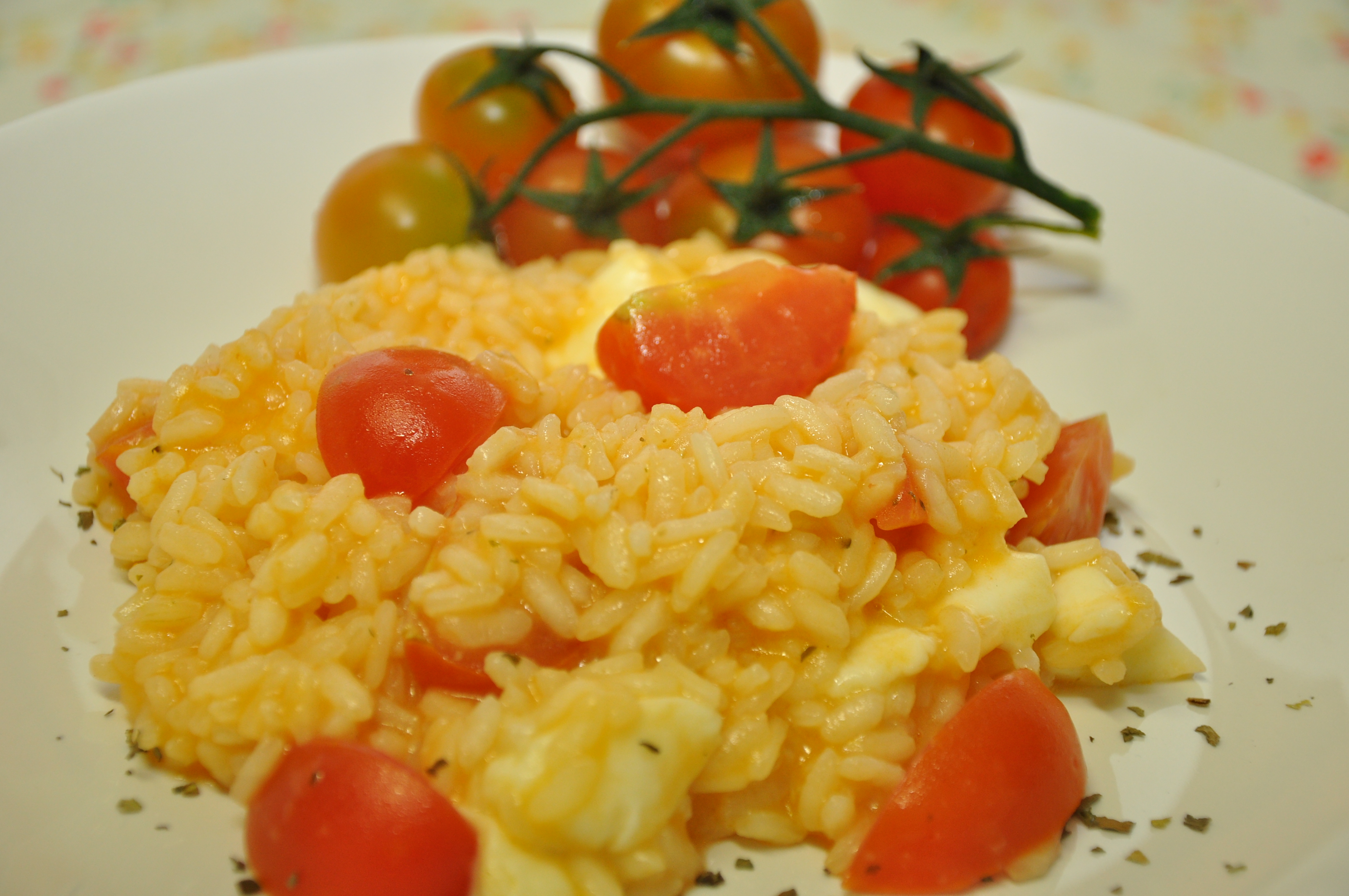 A última concha de caldo não deve secar para que o risoto fique bem úmido. Então, assim que colocar a última, em seguida já acrescente o queijo parmesão ralado misturando bem. Coloque os tomatinhos, mexa de novo e rapidamente coloque o queijo de búfala. Misture bem e desligue o fogo. Sirva em seguida. (serve 4 pessoas)