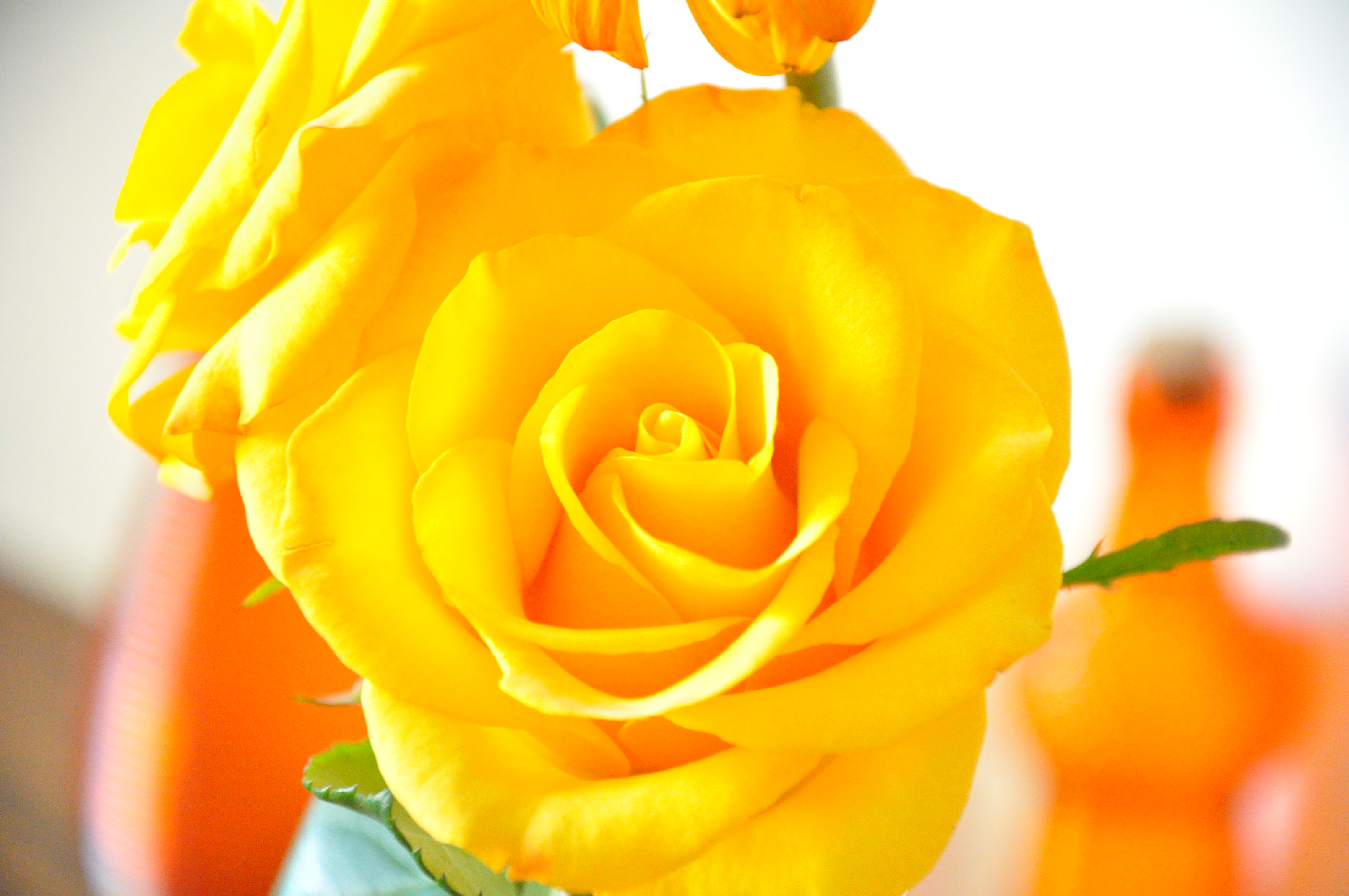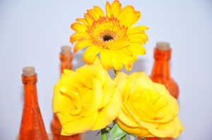 Então comprei pequenos vasinhos de calandivas para as mesas, eles são pequenos e favorecem o contato visual das pessoas. Para o aparador, comprei apenas 2 rosas e uma gérbera, todas num tom de amarelo intenso, lindas! Tomei o cuidado de combinar as toalhas e os guardanapos com as flores, peguei uma das minhas queridas garrafas de azeite e as coloquei nela. Simples! Mas todos comentaram o quanto elas eram lindas!