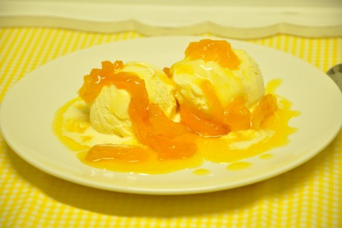 Corte os damascos em tirinhas e deixe submersos no suco de laranja por pelo menos 30 minutos para hidratar (dobra de tamanho). Depois coloque numa panela e acrescente o açúcar e deixe cozinhar por aproximadamente 40 minutos ou até que a calda fique encorpada. Essa calda pode ser servida quente ou fria sobre o sorvete de creme, mas se for servir fria precisa observar a expessura da calda, pois quando esfria fica mais grossa.