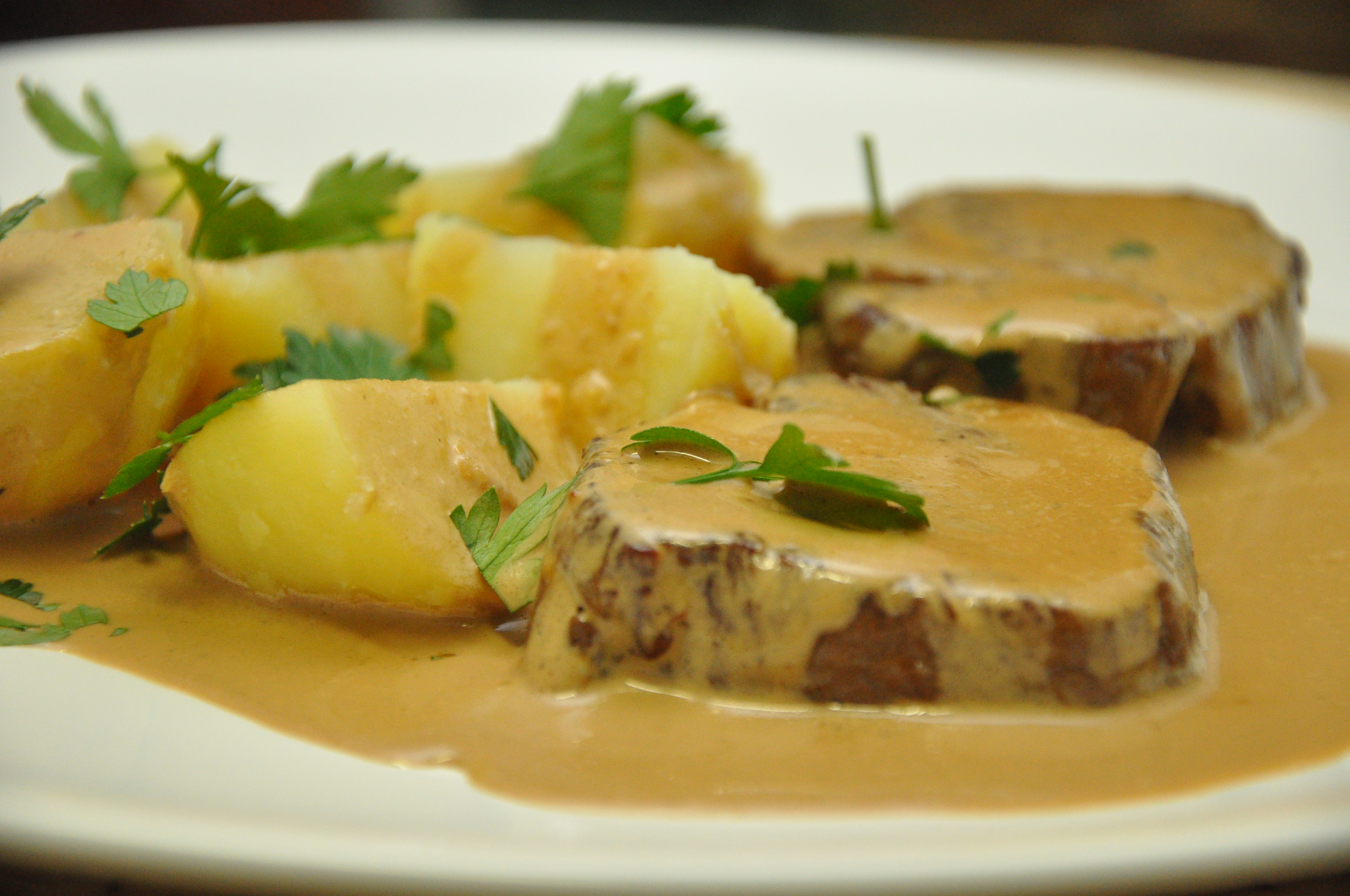 Deixe ferver em fogo médio por 5 a 7 minutos para reduzir um pouco, ficando de olho para não queimar. Por último, acrescente o creme fresco e misture até incorporar bem. Prove e acerte o sal , se necessário, é provável que não precise, pois o molho de soja já é bem salgado. Devolva os filés na frigideira e deixe até ver que está aquecido. Sirva imediatamente com as batatas cozidas colocando um pouco de molho sobre elas, pois vai servir de tempero, se for necessário reaqueça as batatas antes de servir. Salpique a salsa picada por cima e bom apetite! Você vai ver que ninguém diz que foi feito com shoyu! Foi por isso que dei esse nome pra receita.