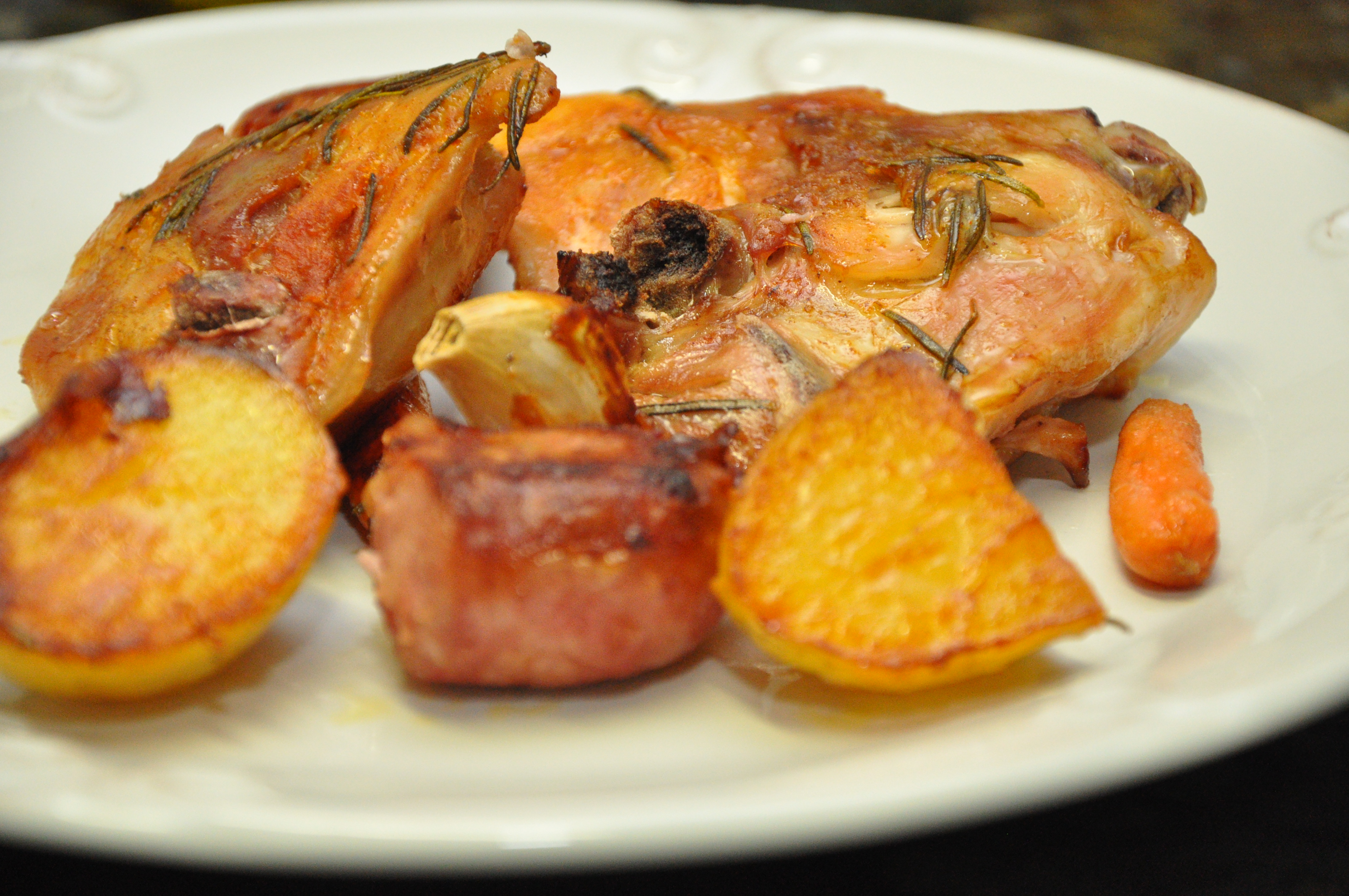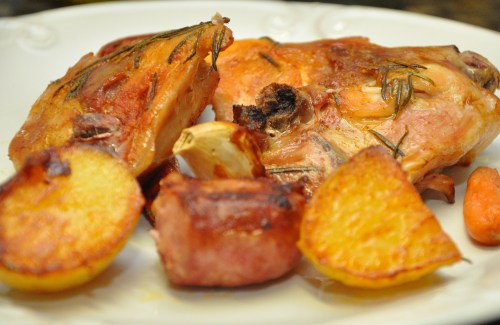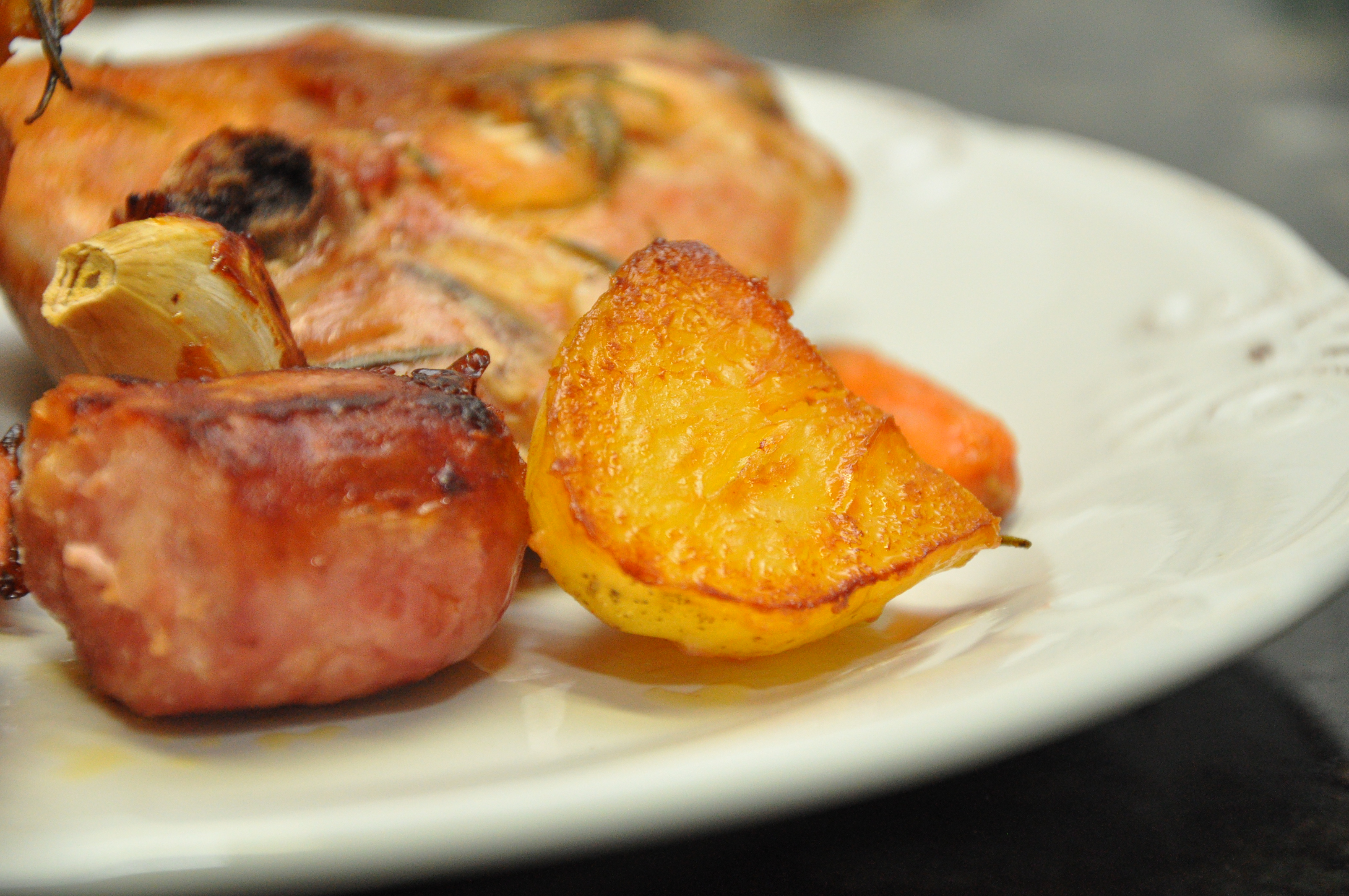 Corte as linguiças ao meio e acomode entre os pedaços de frango. Lave as batatas e corte ao meio sem retirar a casca, acomode as batatas entre os pedados e frango e linguiça, sempre com a casca para cima. Faças o mesmo com as cenouras e os dentes de alho com casca. Depois de tudo acomodado, regue com azeite e leve ao forno em 250 graus por aproximadamente 40 minutos. Cuide para que todos os ingredientes fiquem encostados no fundo da assadeira, pois o azeite e a gordura da linguiça é que vão servir de tempero para os legumes.