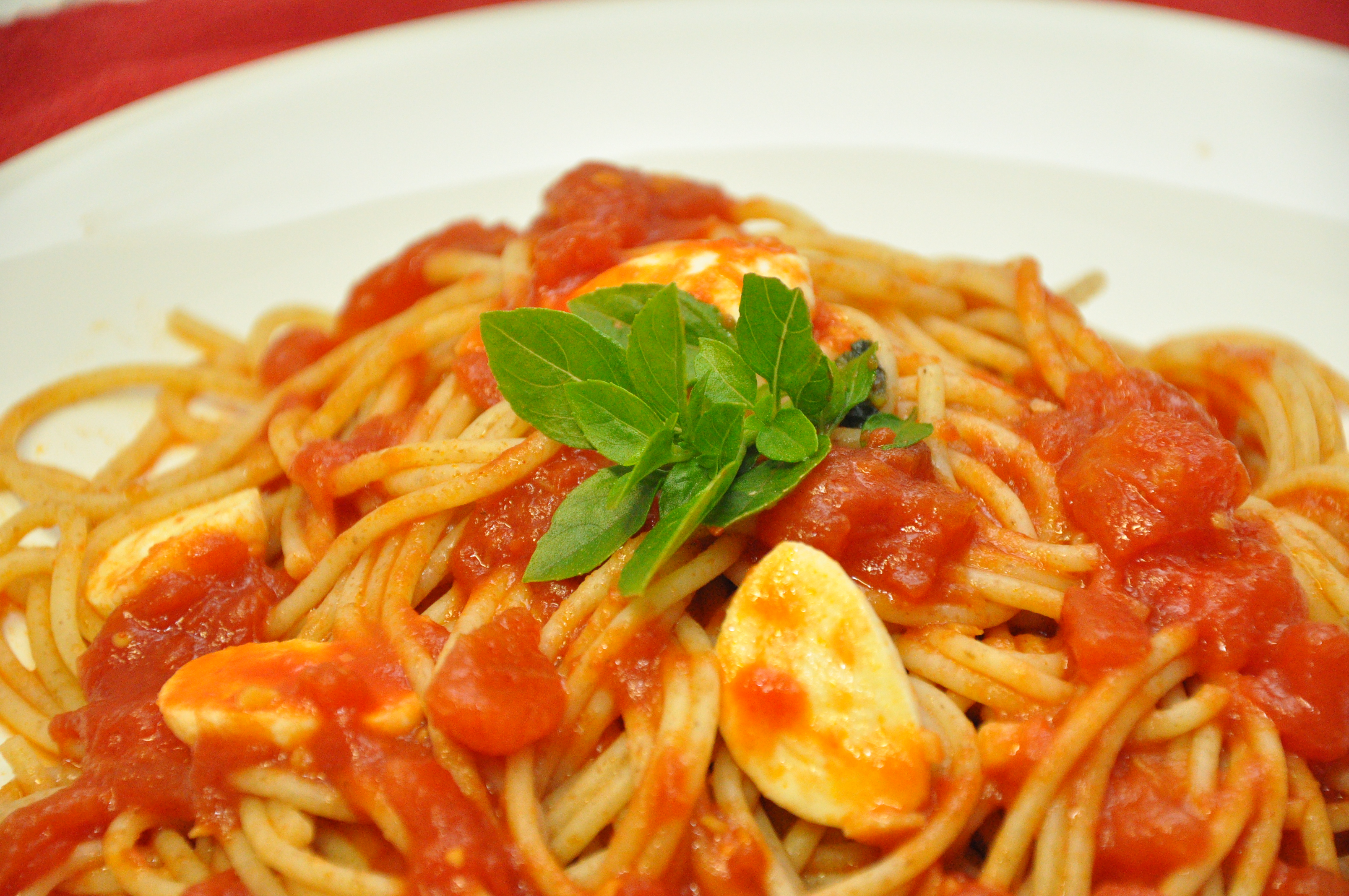 Se nesse momento o espaguete ainda não estiver ao dente, desligue o molho e aguarde. Assim que a massa estiver pronta, reacenda o fogo do molho e separe uma xícara deste molho para dar o toque final. Quando começar a borbulhar acrescente o espaguete, misture bem e só então desligue o fogo. Misture as mussarelinhas cortadas ao meio.