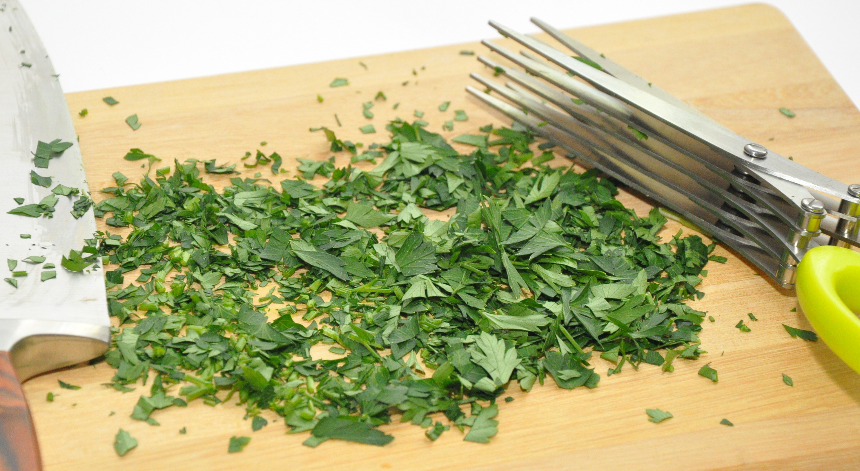 Outra forma de picar salsinha é utilizar uma tesoura própria para cortar ervas, mas o resultado é uma salsinha picada um pouco maior, o que dependendo do prato a ser feito, fica ainda mais bonito. Eu, como boa curiosa que sou, comprei uma e já testei, funcionou como você vê na foto, mas dá pra ver a diferença de tamanho entre a salsinha picada com a faca e a cortada com a tesoura. Também é preciso secar a salsinha antes de cortar. (fotos: eugourmet)