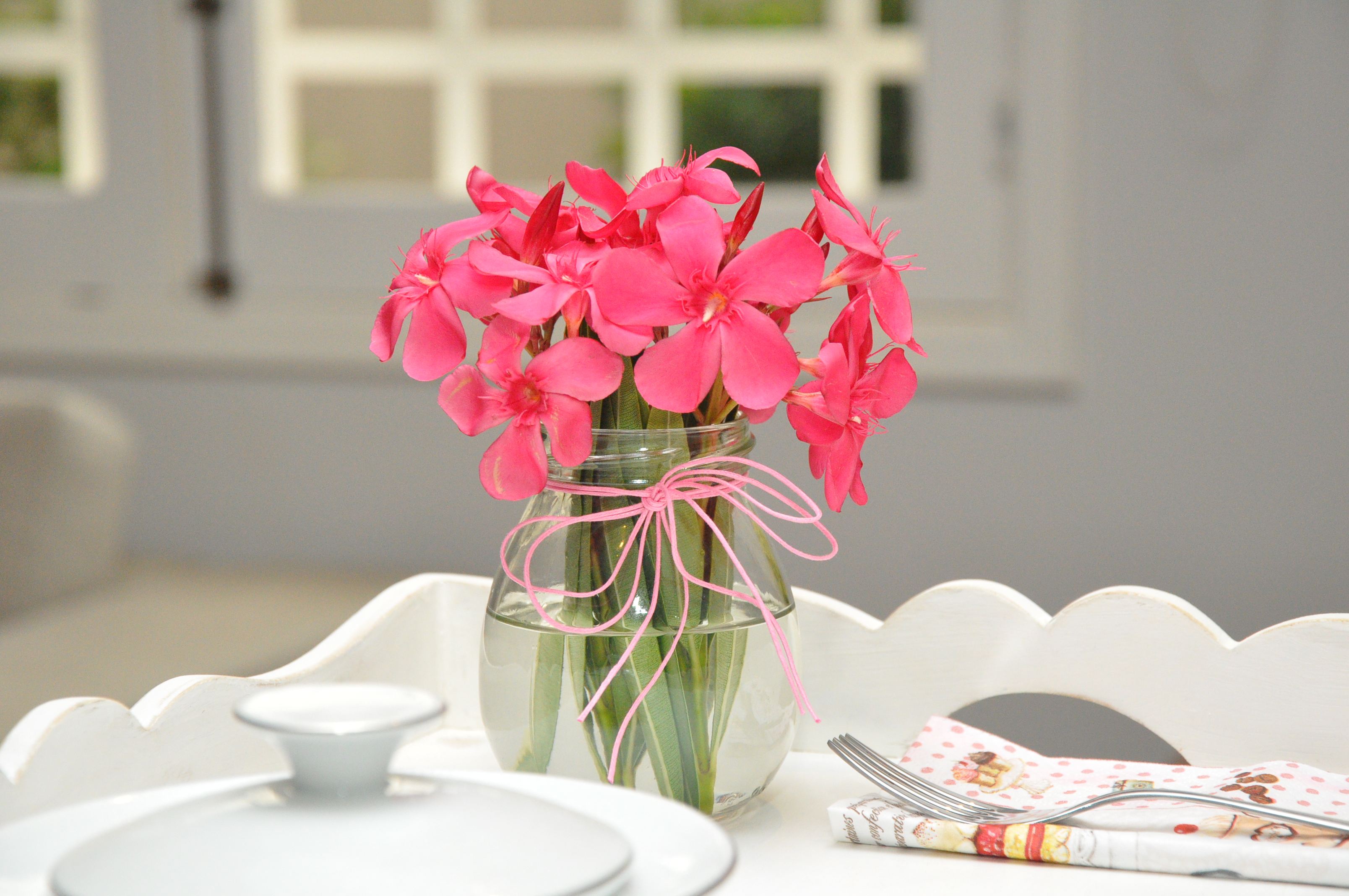 A verdade é que eu já fico imaginando como posso aproveitar o pote depois que estiver vazio, compor arranjos e até servir sobremesas inusitadas. É lógico que guardo todos eles bem limpos e de forma organizada, não sou acumuladora de lixo tá! E essas florezinha colhi numa árvore de calçada enquanto fazia uma caminhada. Simples e carinhoso para servir uma pessoa especial!