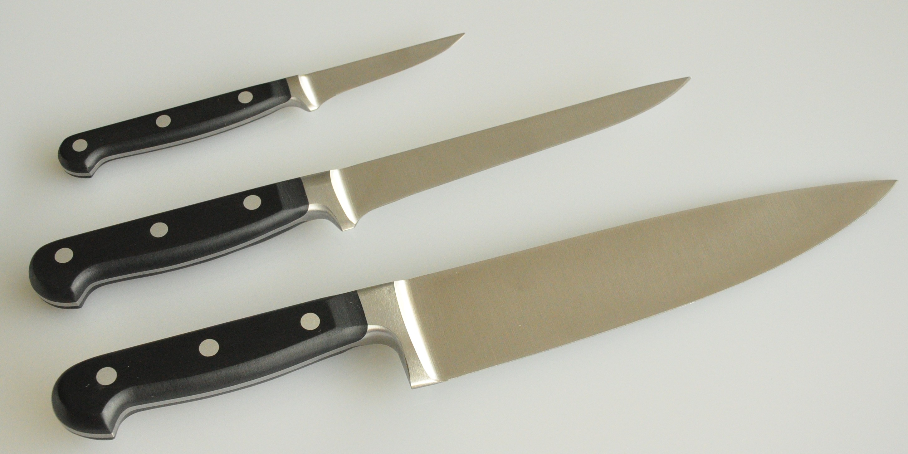 É um trio de facas muito legal de se ter em casa. Sobre a faca de chef, já escrevi num outro post, e ela continua sendo um item indispensável na cozinha, que serve para cortar carne, picar cebola, ervas e etc., mas se você quer melhorar o seu “arsenal” vai precisar de pelo menos mais duas delas.