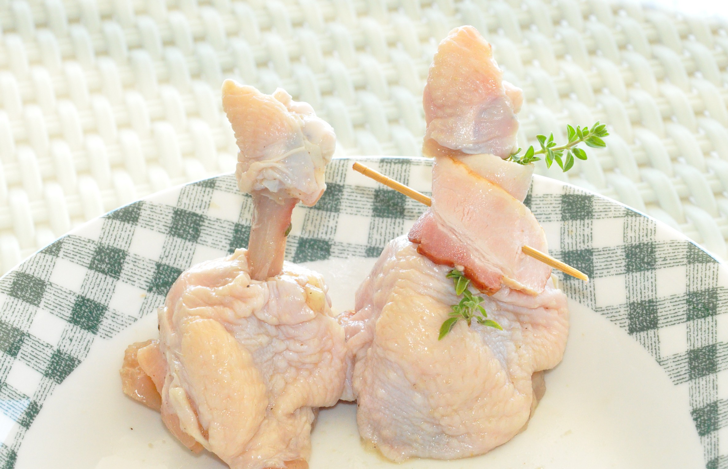 Antes de qualquer coisa é necessário expor o osso da coxinha fazendo um corte na base com uma faca de desossa, preferencialmente, ou uma faca com bom corte. Corte a pele, circulando a faca e aos poucos vá cortando os pequenos nervos que ficam por dentro. Depois raspe a faca no osso (sentido da base para a carne) para deixar o osso bem solto e a gordura do bacon penetrar na carne enquanto assa. (hummmm!!)