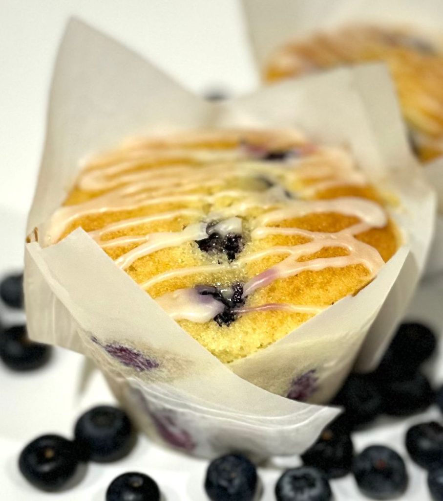 Adicione a baunilha e o femento, sem bater. Por último acrescente os mirtilos enfarinhados com bastante cuidado para não retirar a farinha. Ela vai ajudar para que eles não afundem na forminha.