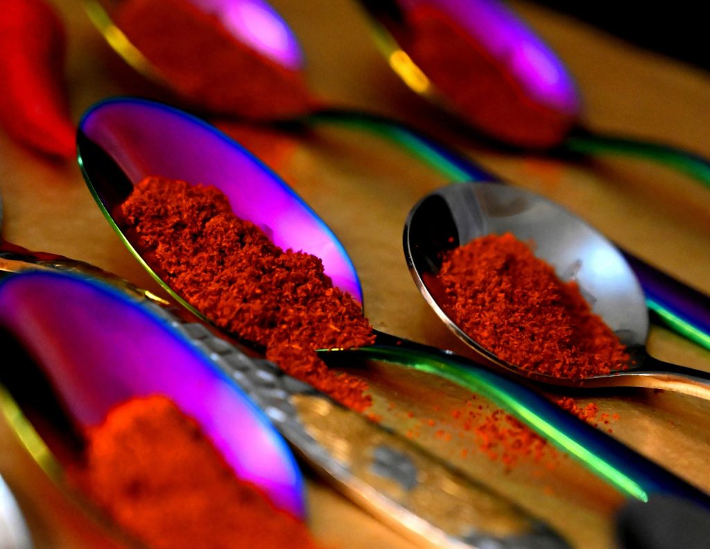 - Páprica Picante (ou Apimentada) – Tem sabor mais intenso e picante, graças à presença de pimentões mais fortes, suas sementes e partes internas. Perfeita para dar sabor e calor aos pratos, é mais usada em ensopados apimentados, marinadas de carnes vermelhas, chilis e pratos mexicanos, ovos temperados