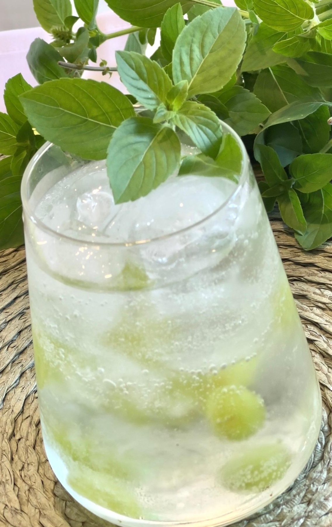Acrescente metade das uvas cortadas ao meio, coloque mais gelo e a segunda metade das uvas. Adicione o saquê de uva verde e complete com água com gás. Mexa bem, decore com folhas de manjericão e sirva em seguida. Ou melhor, beba em seguida!